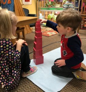 For example, we can set up rugs throughout our common work space and call older students to walk around them, not over or across them. It is in this way that they demonstrate to the younger children how to walk through our classroom politely.