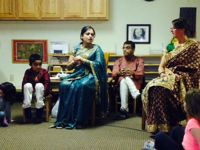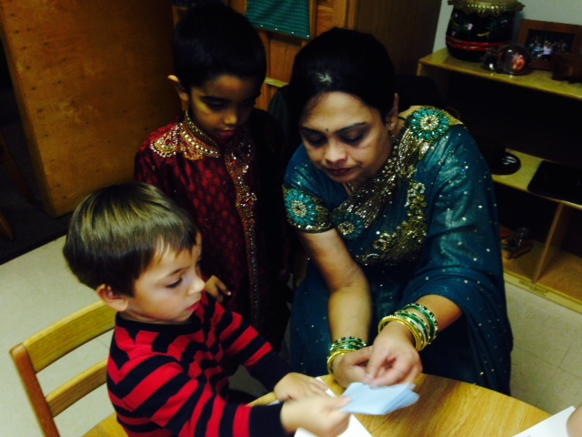 I would like to extend a big “thank you” to Bhargava’s parents, Madhavi and Rajesh! On November 4th, Madhavi Thombre and Rajesh Kulkarni came in to celebrate Diwali. This is India’s most important holiday of the year, sometimes called “Festival of Lights”. The festival began as a celebration of the last harvest of the year before winter and a time for Indians to thank Lakshmi, the Goddess of Wealth, for the harvest and to get her blessings for the New Year. Madhavi and Rajesh, along with Bhargava, shared with us some of the traditions of this holiday, brought us all a special traditional dessert and worked with the children to create their own lanterns. Thank you again for sharing with us.