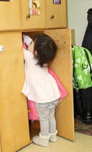 “Toddler preparing for the day – hanging her items in her cubby, first the coat and then the backpack”
