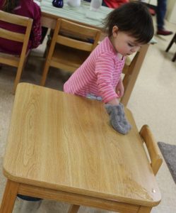 It is easier for a child to see the steps of a practical life activity if broken down instead of grabbing a random cloth and begin wiping. This way a child can slow his movements and work on his skills.